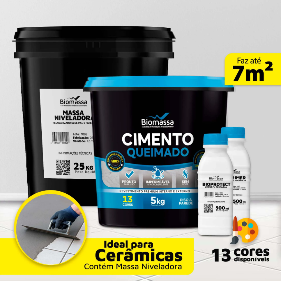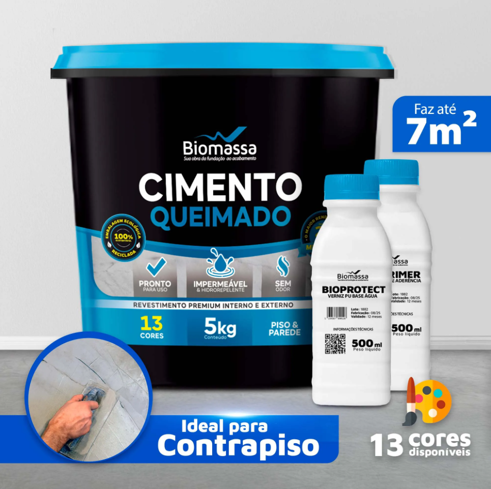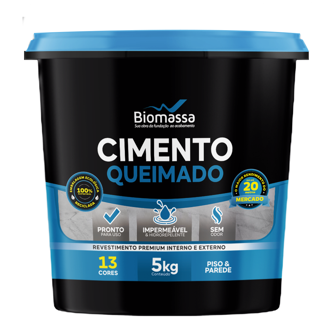 É uma massa pronta pra uso de efeito decorativo desenvolvida especialmente para visual estético e está disponível em 13 cores. O Cimento Queimado Biomassa é um material resistente, impermeável e hidro-repelente que permite a aplicação tanto em áreas internas como externas.